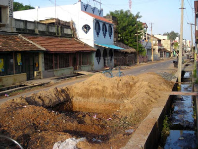Around five months back (supposedly) State Highway Department laid roads in Bodi Chetty street which is now damaged in the underground drainage construction work as seen in the photograph above. A open sewage line was constructed just before laying the road. I wonder what would be the necessity for this open sewage line (rain water drain ? - if that is the case I still wonder how rain in the road will get into this - the concrete wall of the sewage line is well above the road level) while underground drainage system is coming up. Now for the houses to connect with underground drainage system, the concrete walls of this open sewage line will be broken apart. This is how the game is played!!